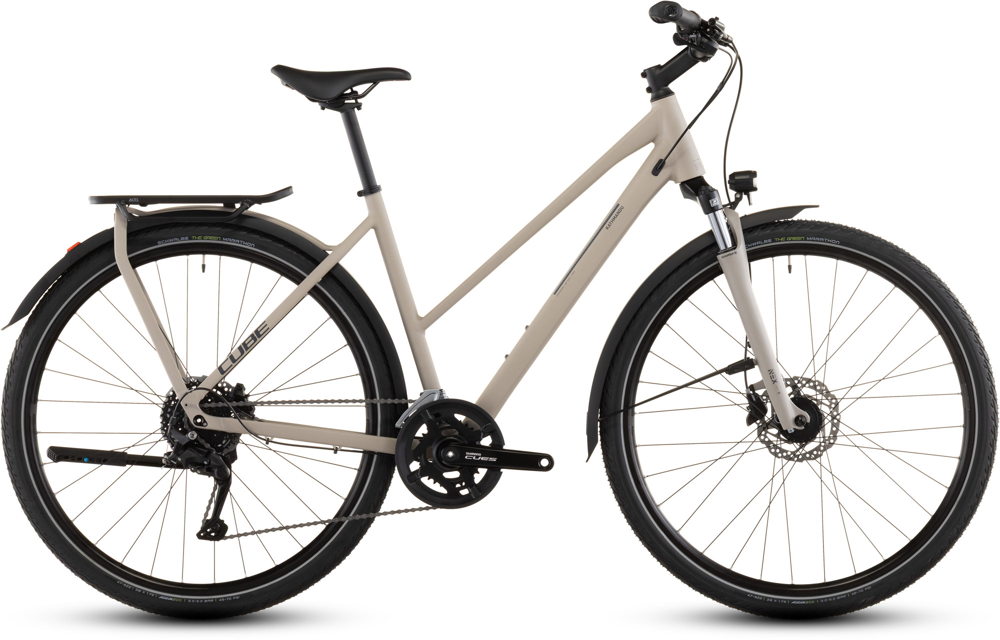 Mit der brandneuen, einfach zu bedienenden Cues 2×9-fach Schaltung von Shimano wechselst du zuverlässig und sicher von Gang zu Gang. Kraftvolle hydraulische Scheibenbremsen sorgen für sichere Bremsmanöver, selbst bei Nässe. Apropos Nässe: CUBE hat dem Bike neben einem Seitenständer und Lichtern auch Schutzbleche spendiert. On top gibt’s eine komfortable Federgabel, die Buckel und Löcher auf der Strecke wegschluckt wie nichts. Also, wohin soll die nächste Tour gehen?
